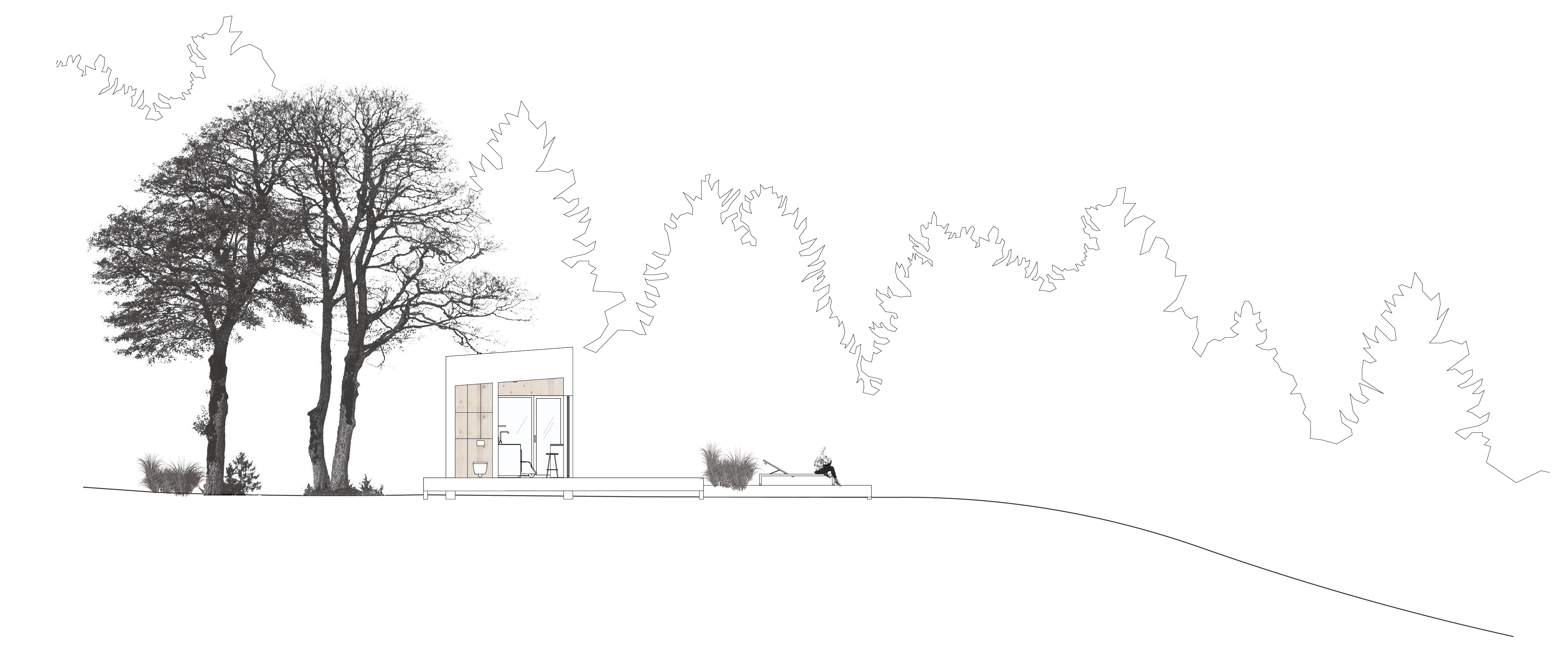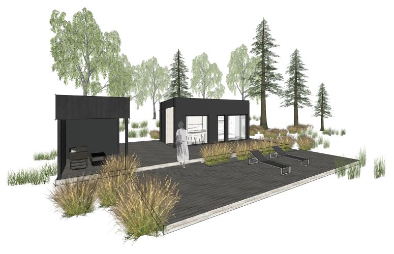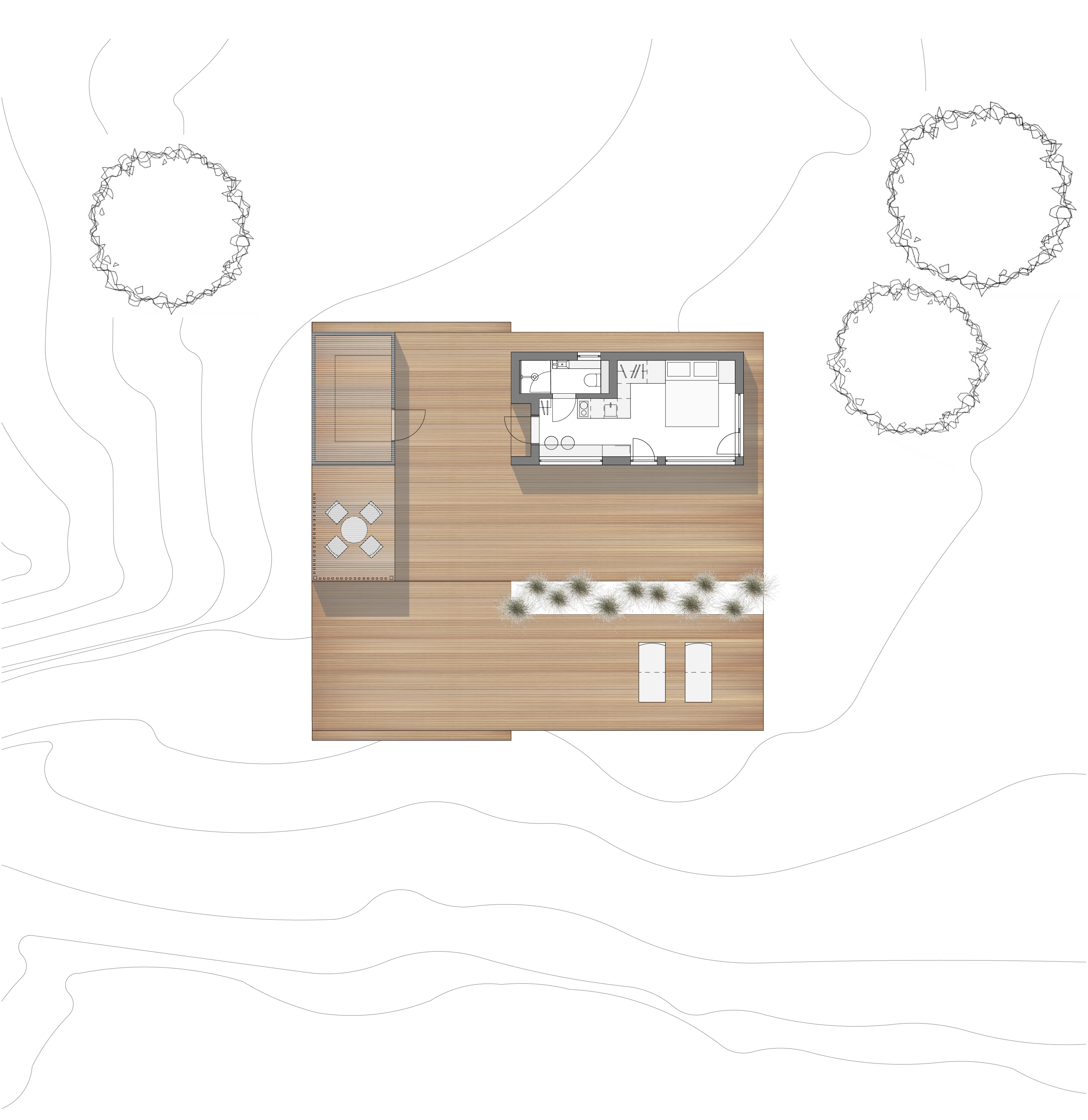 Ratsionaalne ja liialdusteta lähenemine sai väikemajatootja poolt näidatud projekti edasiarenduse lähtepunktiks. Lihtsa vormiga mikromaja ilmestavad kauneid järve- ja metsavaateid pakkuvad kõrged aknad ja maja sisemusse lõikuv sissepääs. Siseruumi aitab visuaalselt suuremaks muuta avar, maapinna langusega arvestav puitterrass. Õueruumi muudab kompaktseks ja tuulte eest varjatuks terrassilt ligipääsetav kuur koos varjualusega.