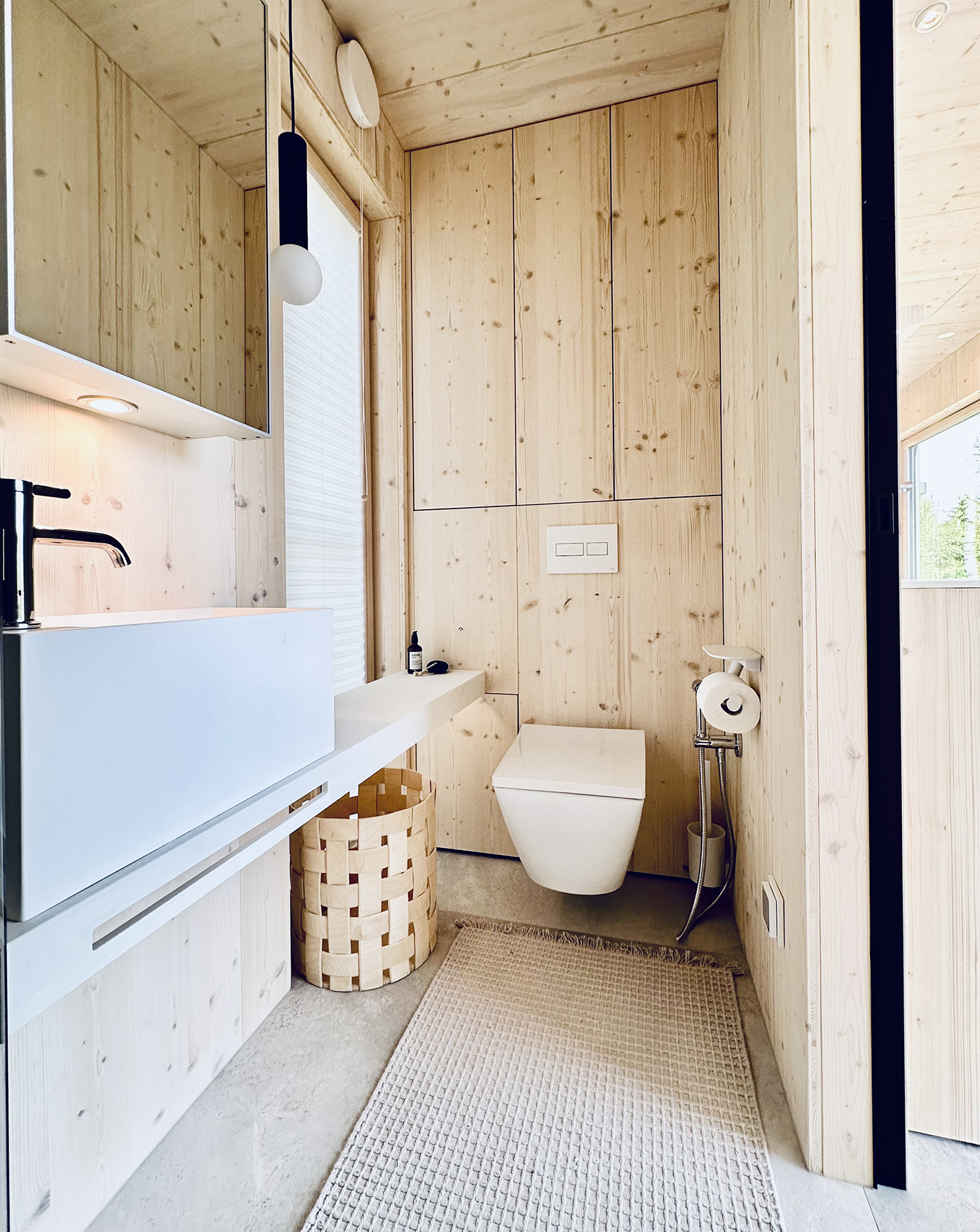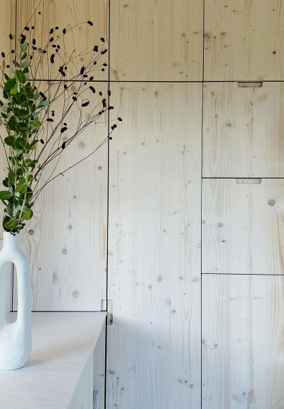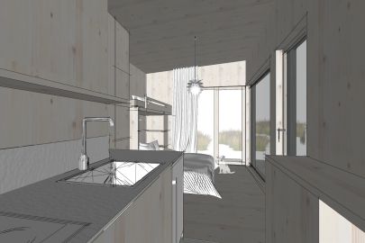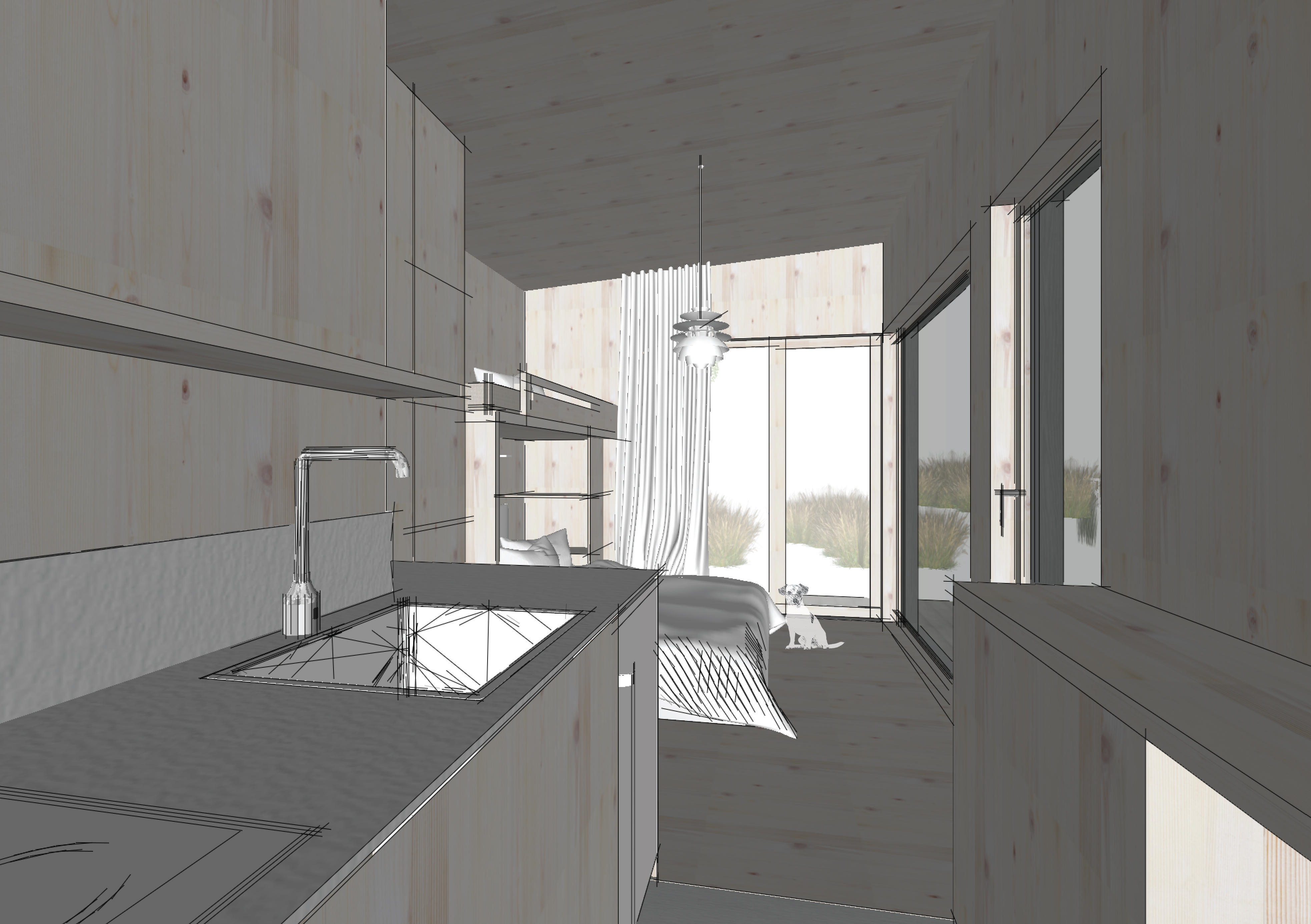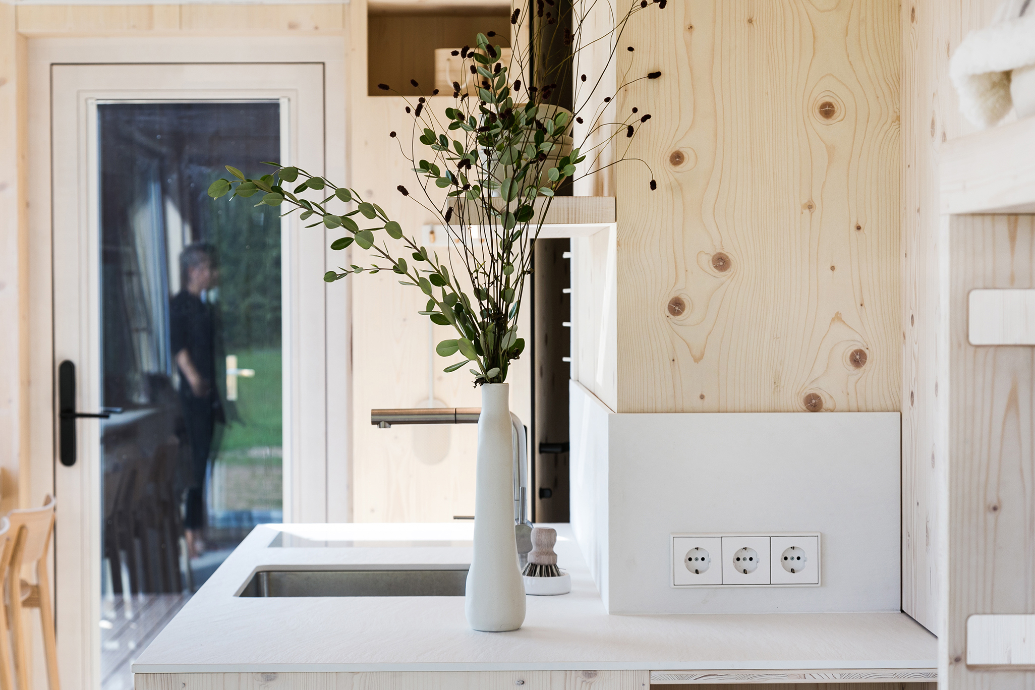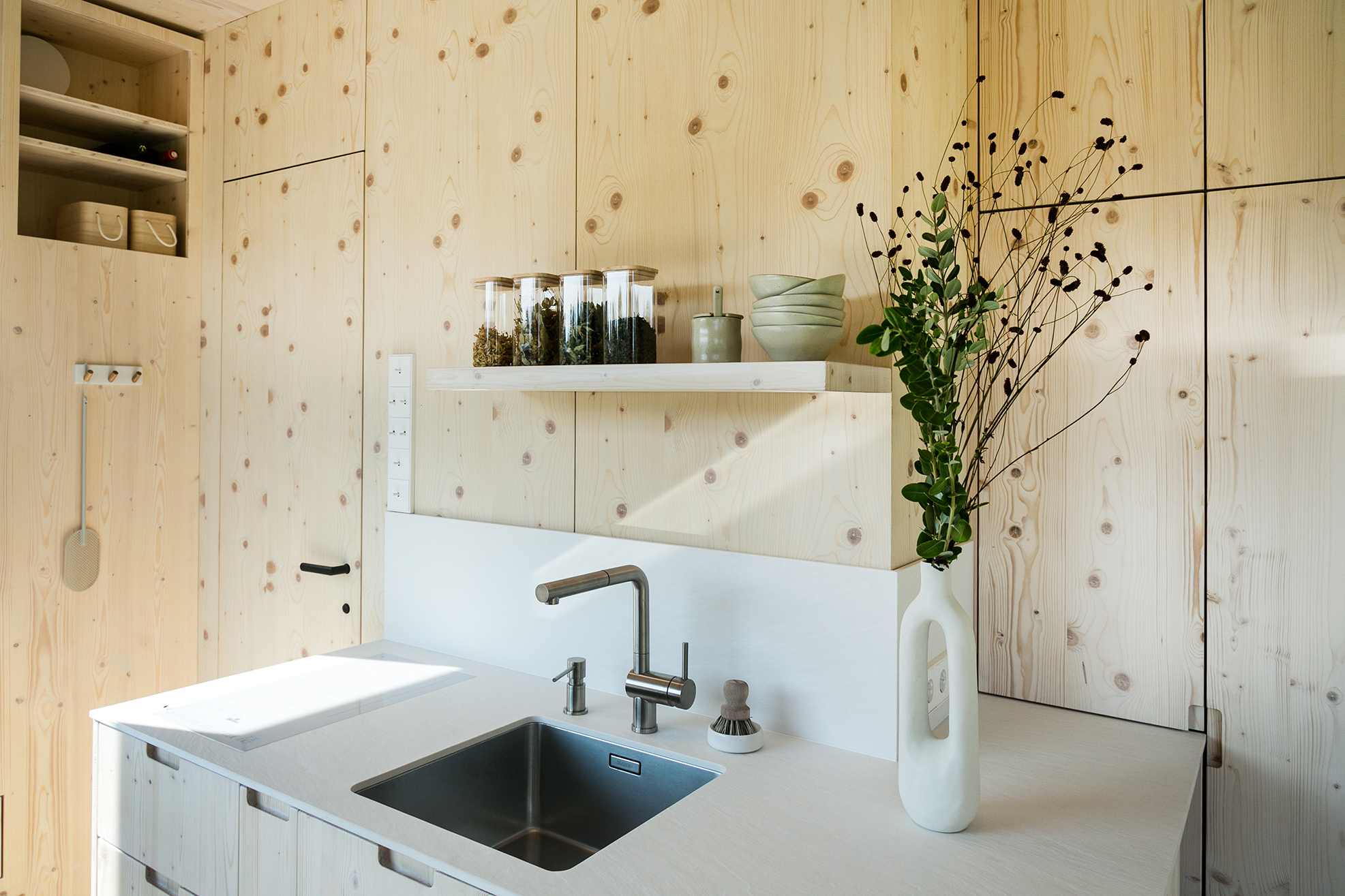 Maja nappidest ruutmeetritest hoolimata seati eesmärgiks, et köögiala ei avaneks otse magamistuppa ja wc-dušširuumis oleks piisavalt avarust. Sentimeeter haaval läbimõeldud funktsionaalselt toimiv lahendus saavutati koostöös erimööbli valmistajaga. Naturaalselt ja valgusküllaselt mõjuva ruumi loomise võtmematerjaliks valiti heleda naturaalse õlivahaga töödeldud kuuse ristkihtpuit. Viimast kasutati nii peamise siseviimistlusmaterjali kui sisseehitatud mööbli puhul.