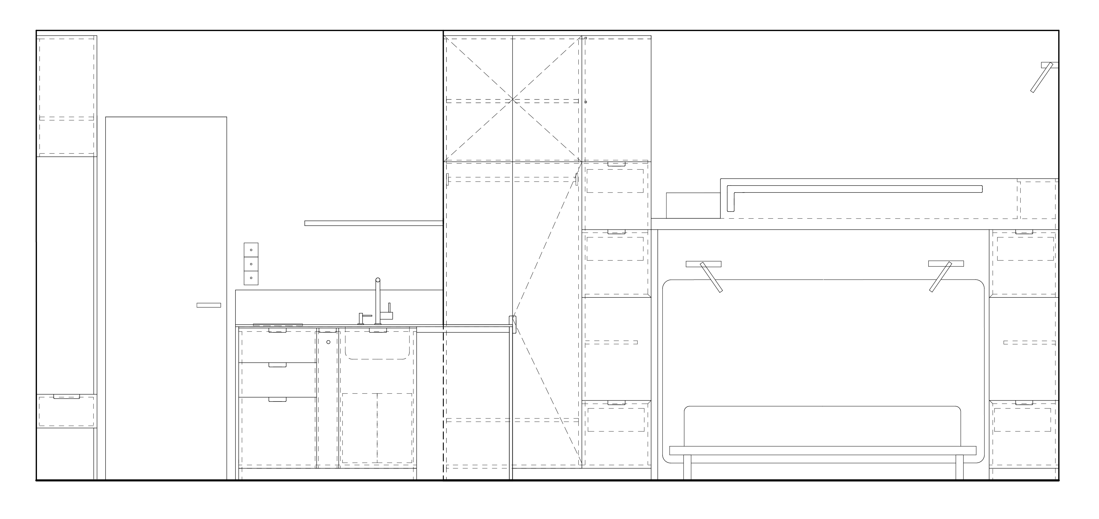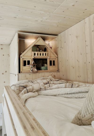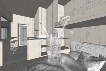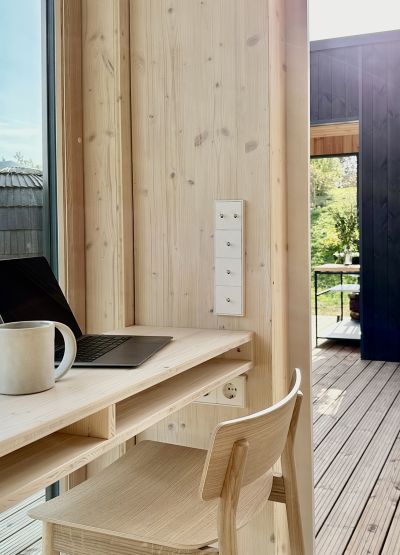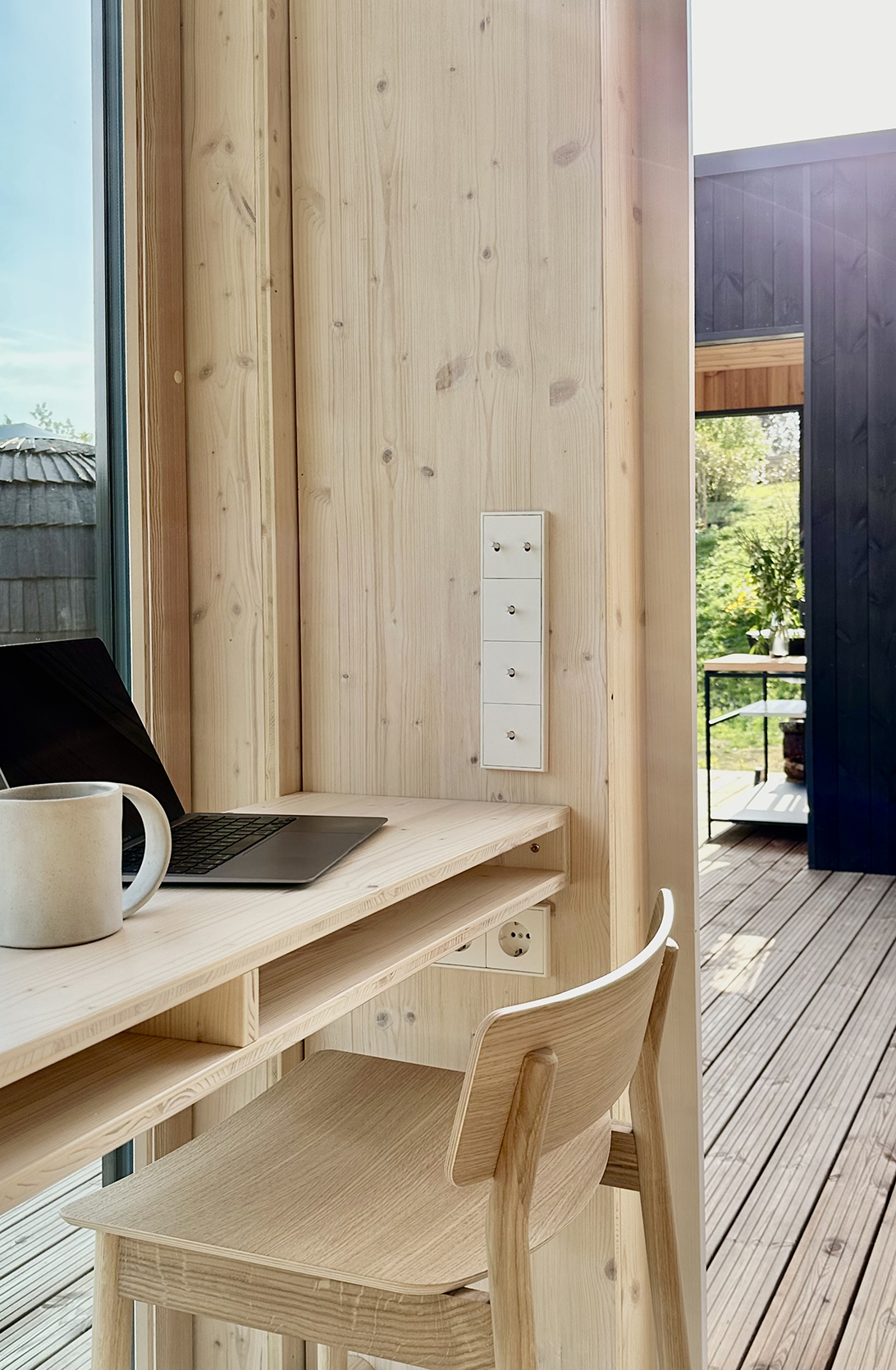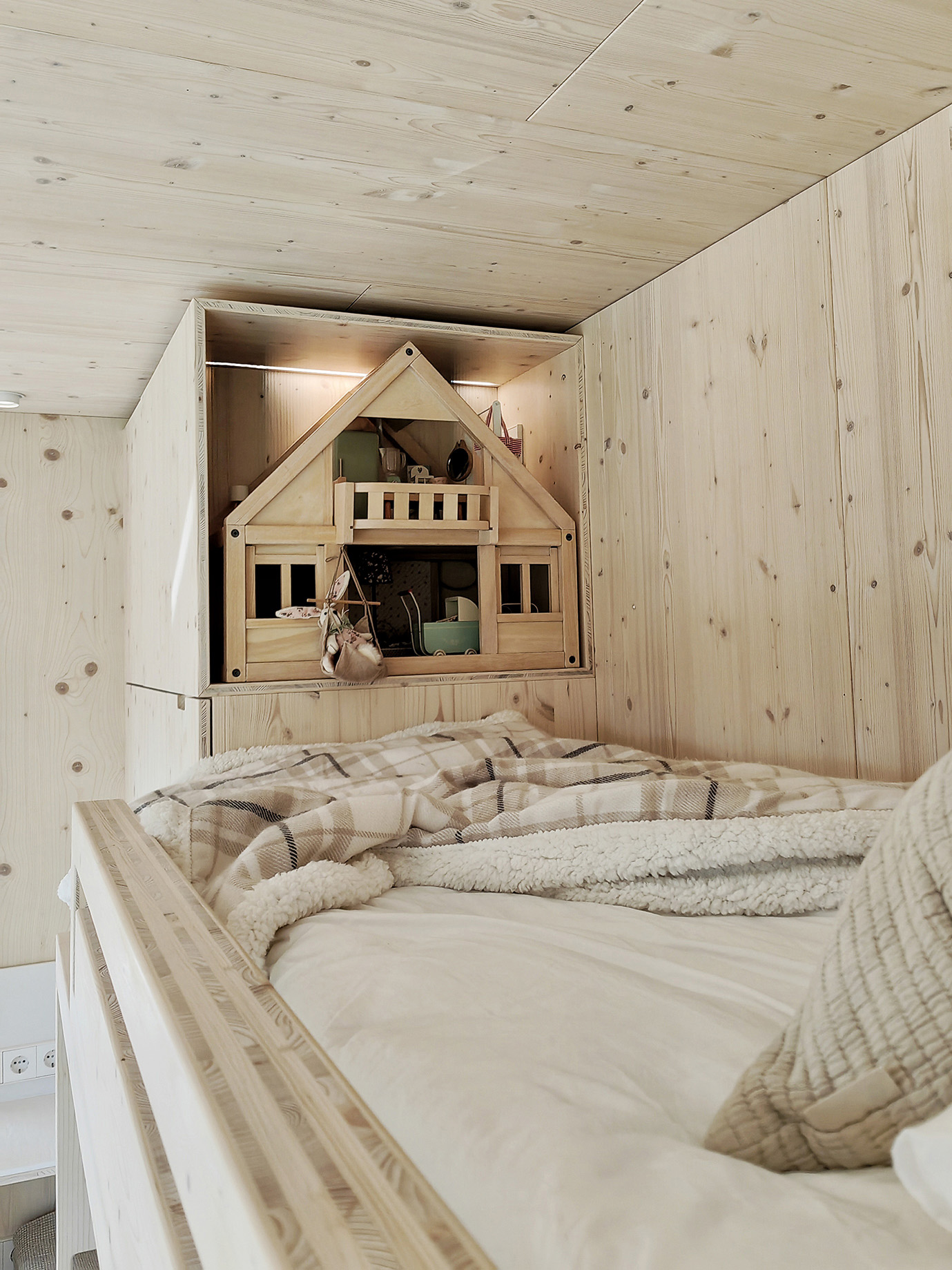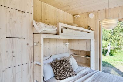 Maja nappidest ruutmeetritest hoolimata seati eesmärgiks, et köögiala ei avaneks otse magamistuppa ja wc-dušširuumis oleks piisavalt avarust. Sentimeeter haaval läbimõeldud funktsionaalselt toimiv lahendus saavutati koostöös erimööbli valmistajaga. Naturaalselt ja valgusküllaselt mõjuva ruumi loomise võtmematerjaliks valiti heleda naturaalse õlivahaga töödeldud kuuse ristkihtpuit. Viimast kasutati nii peamise siseviimistlusmaterjali kui sisseehitatud mööbli puhul.