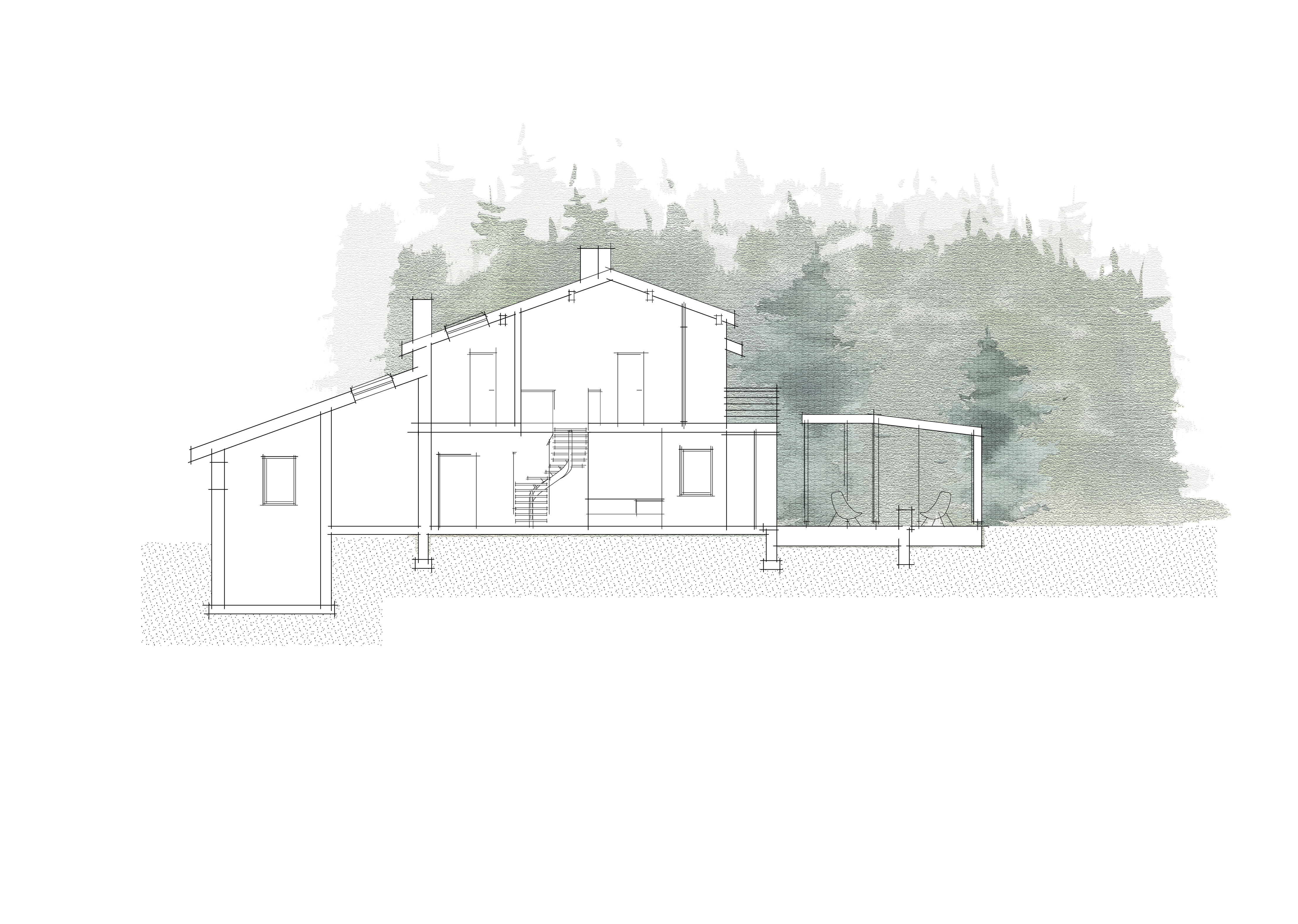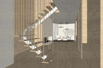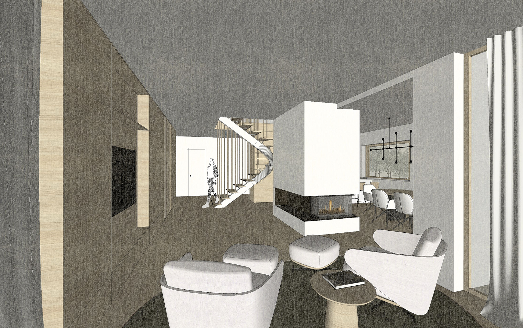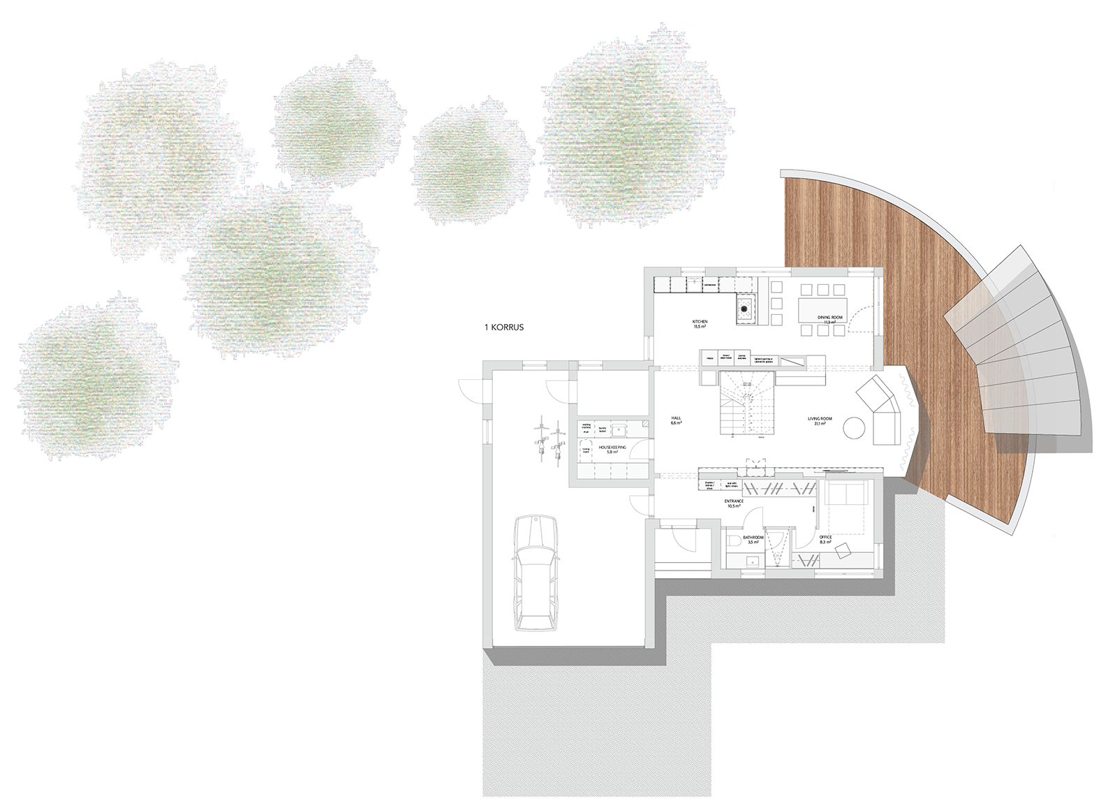 Esimese korruse planeeringu muudatus taotleb eelkõige selget tsoneerimist ja tervikut moodustavat sisekujundust. Nii kujunebki sissepääsust elutoa ja köögini perele ja külalistele avatud loungelik tsoon ja kontor-külalistetoast peidetud privaatne tsoon.