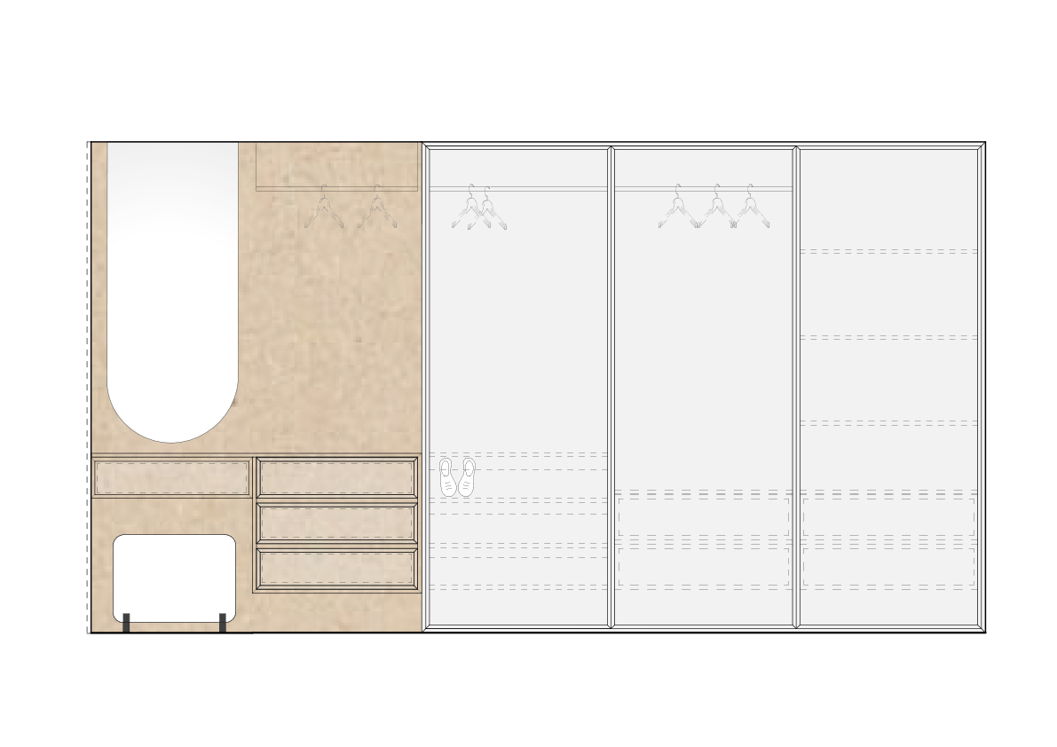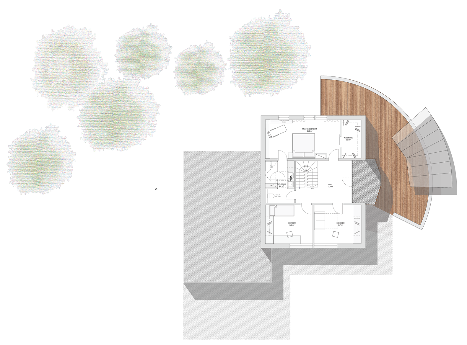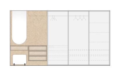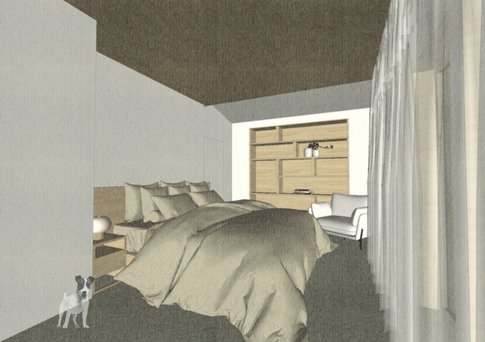 Esimese korruse planeeringu muudatus taotleb eelkõige selget tsoneerimist ja tervikut moodustavat sisekujundust. Nii kujunebki sissepääsust elutoa ja köögini perele ja külalistele avatud loungelik tsoon ja kontor-külalistetoast peidetud privaatne tsoon.