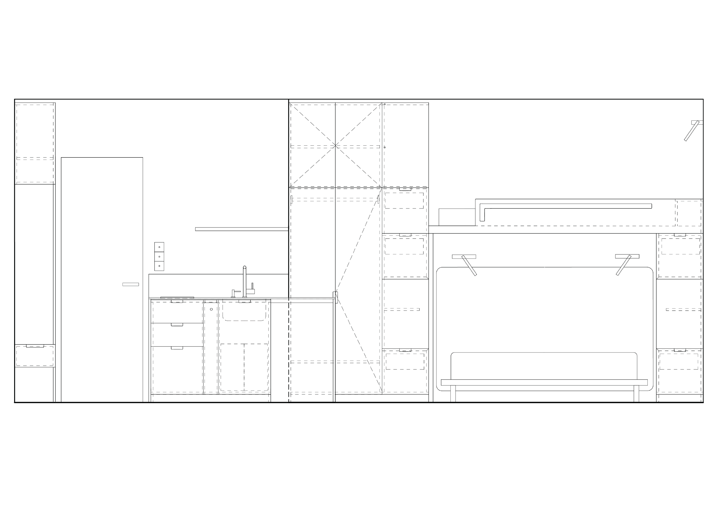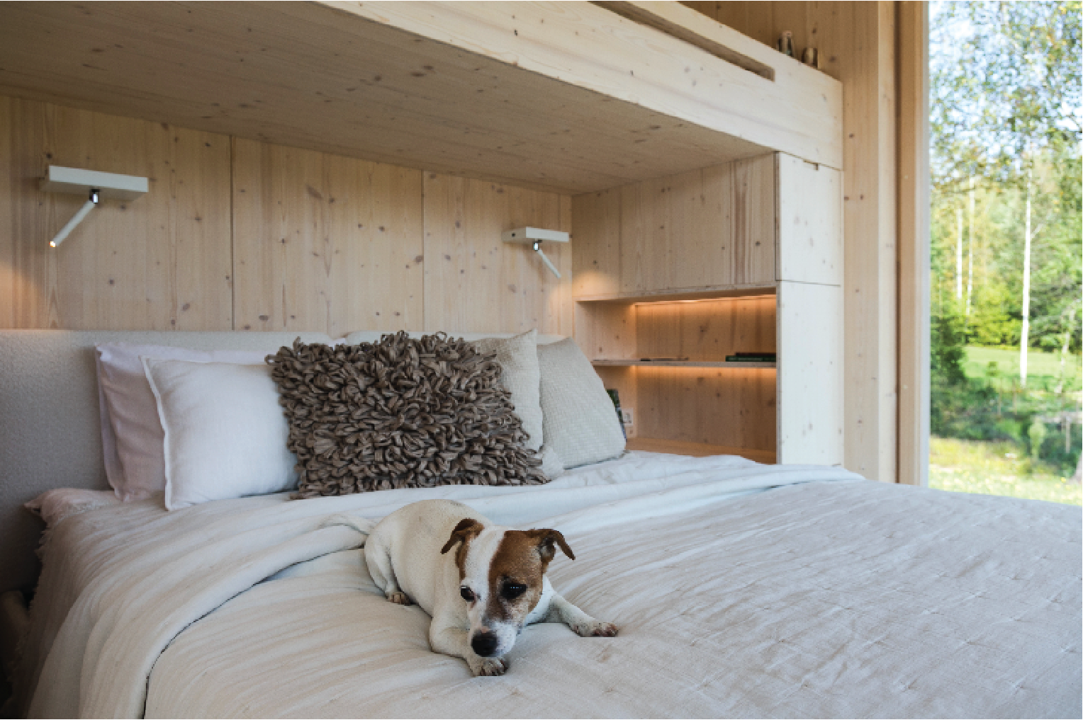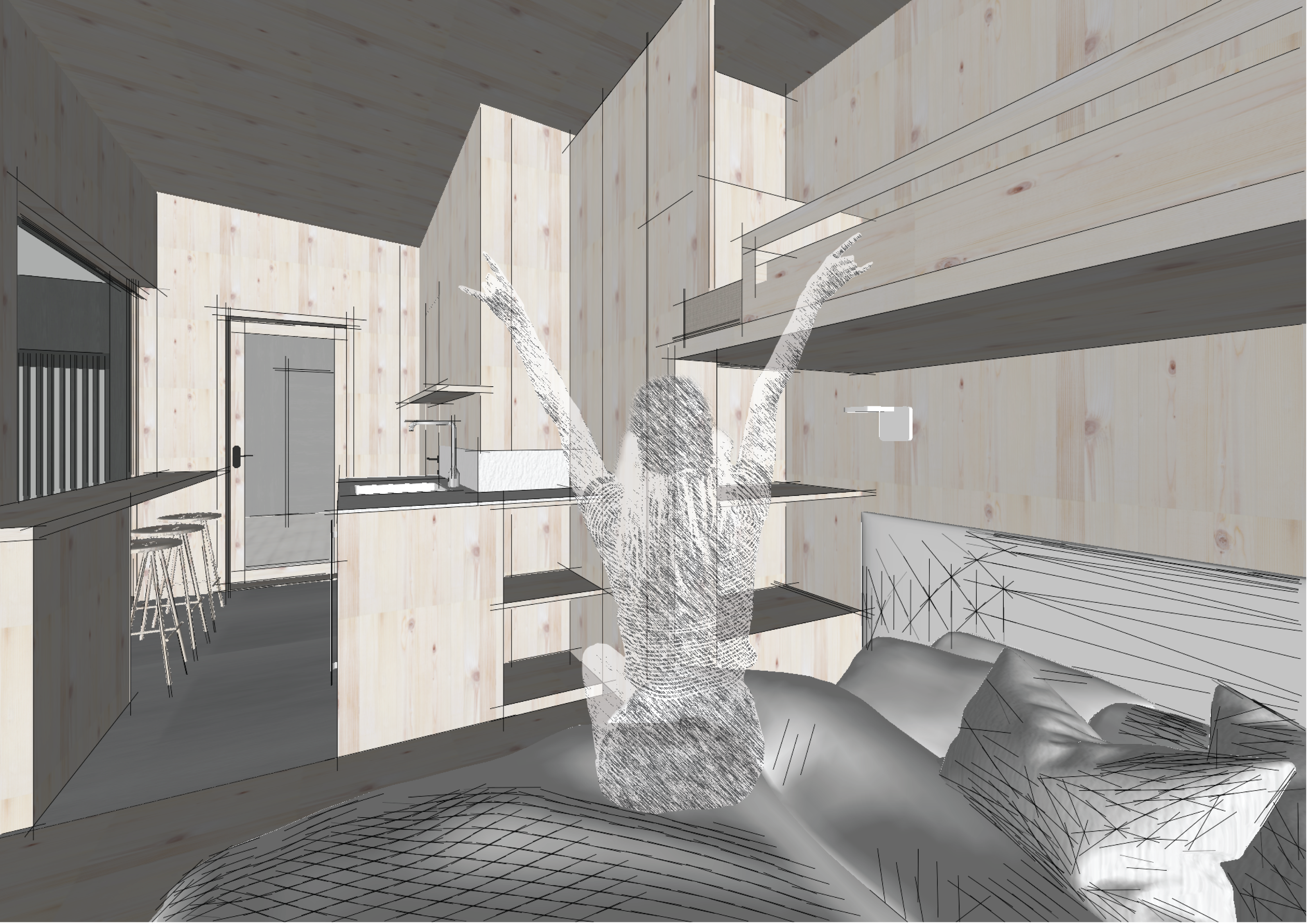 Maja nappidest ruutmeetritest hoolimata seati eesmärgiks, et köögiala ei avaneks otse magamistuppa ja wc-dušširuumis oleks piisavalt avarust. Sentimeeter haaval läbimõeldud funktsionaalselt toimiv lahendus saavutati koostöös erimööbli valmistajaga. Naturaalselt ja valgusküllaselt mõjuva ruumi loomise võtmematerjaliks valiti heleda naturaalse õlivahaga töödeldud kuuse ristkihtpuit. Viimast kasutati nii peamise siseviimistlusmaterjali kui sisseehitatud mööbli puhul.