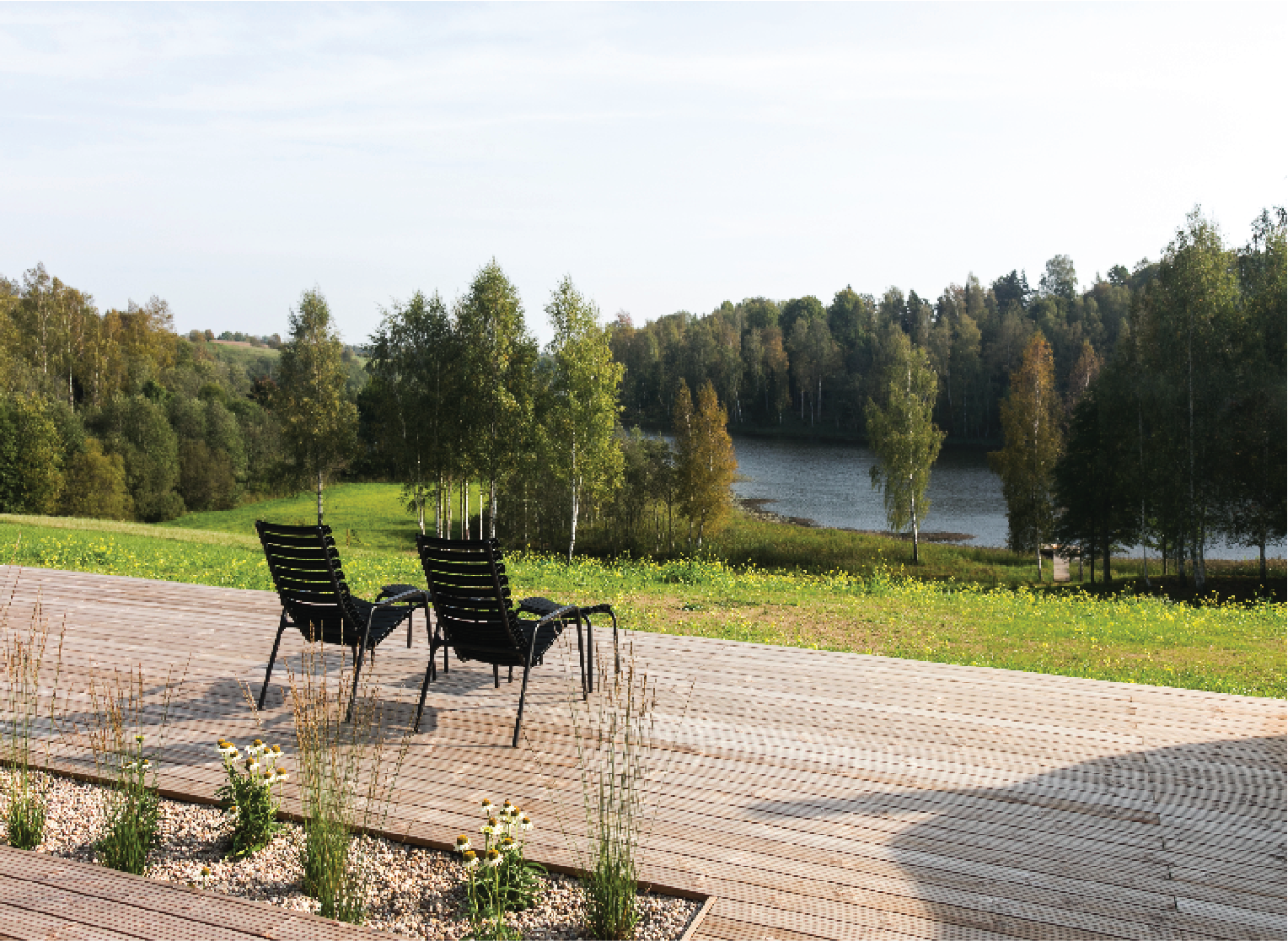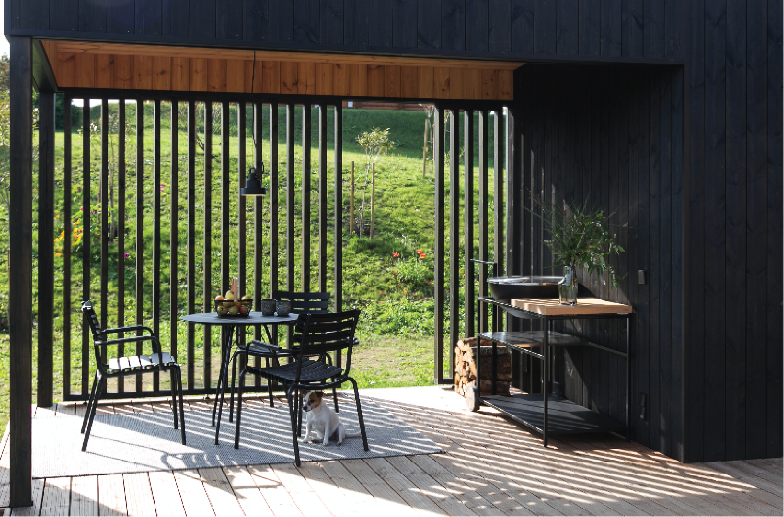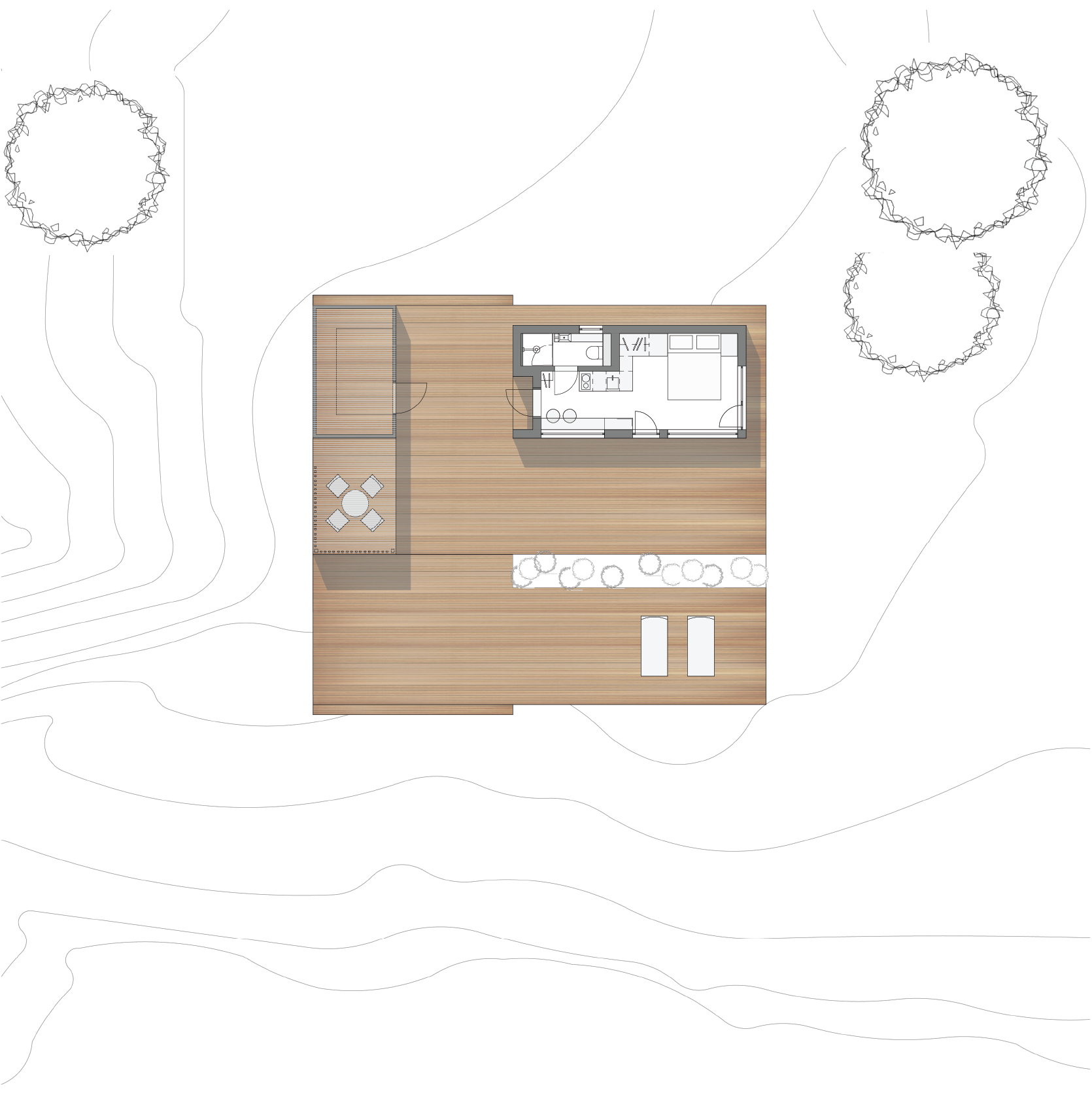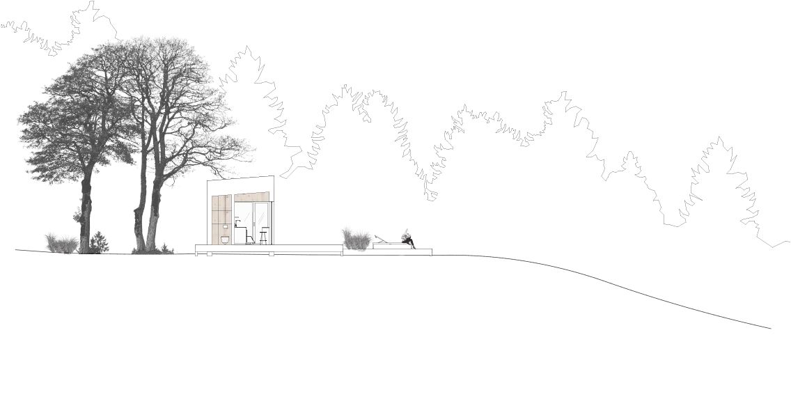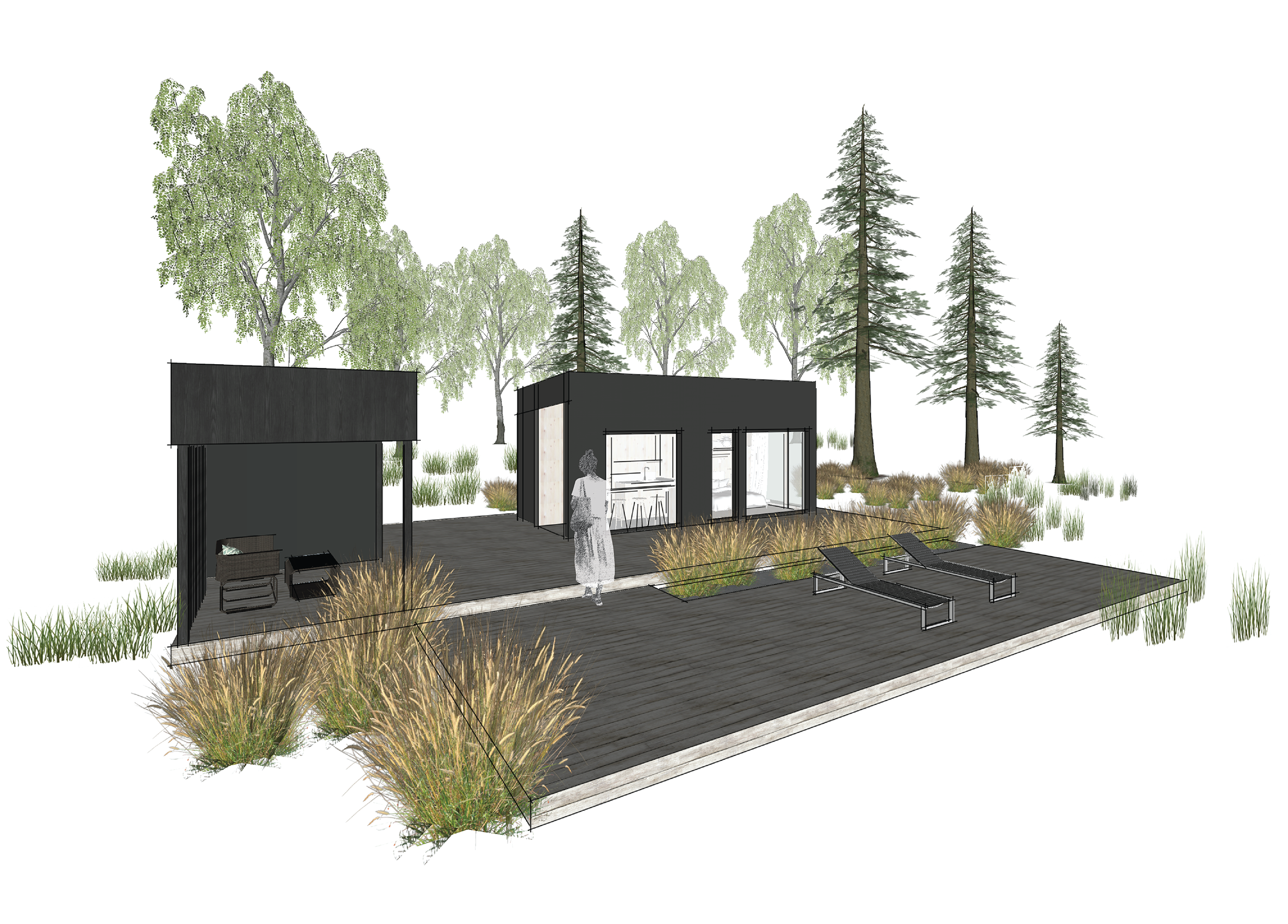 Ratsionaalne ja liialdusteta lähenemine sai väikemajatootja poolt näidatud projekti edasiarenduse lähtepunktiks. Lihtsa vormiga mikromaja ilmestavad kauneid järve- ja metsavaateid pakkuvad kõrged aknad ja maja sisemusse lõikuv sissepääs. Siseruumi aitab visuaalselt suuremaks muuta avar, maapinna langusega arvestav puitterrass. Õueruumi muudab kompaktseks ja tuulte eest varjatuks terrassilt ligipääsetav kuur koos varjualusega.