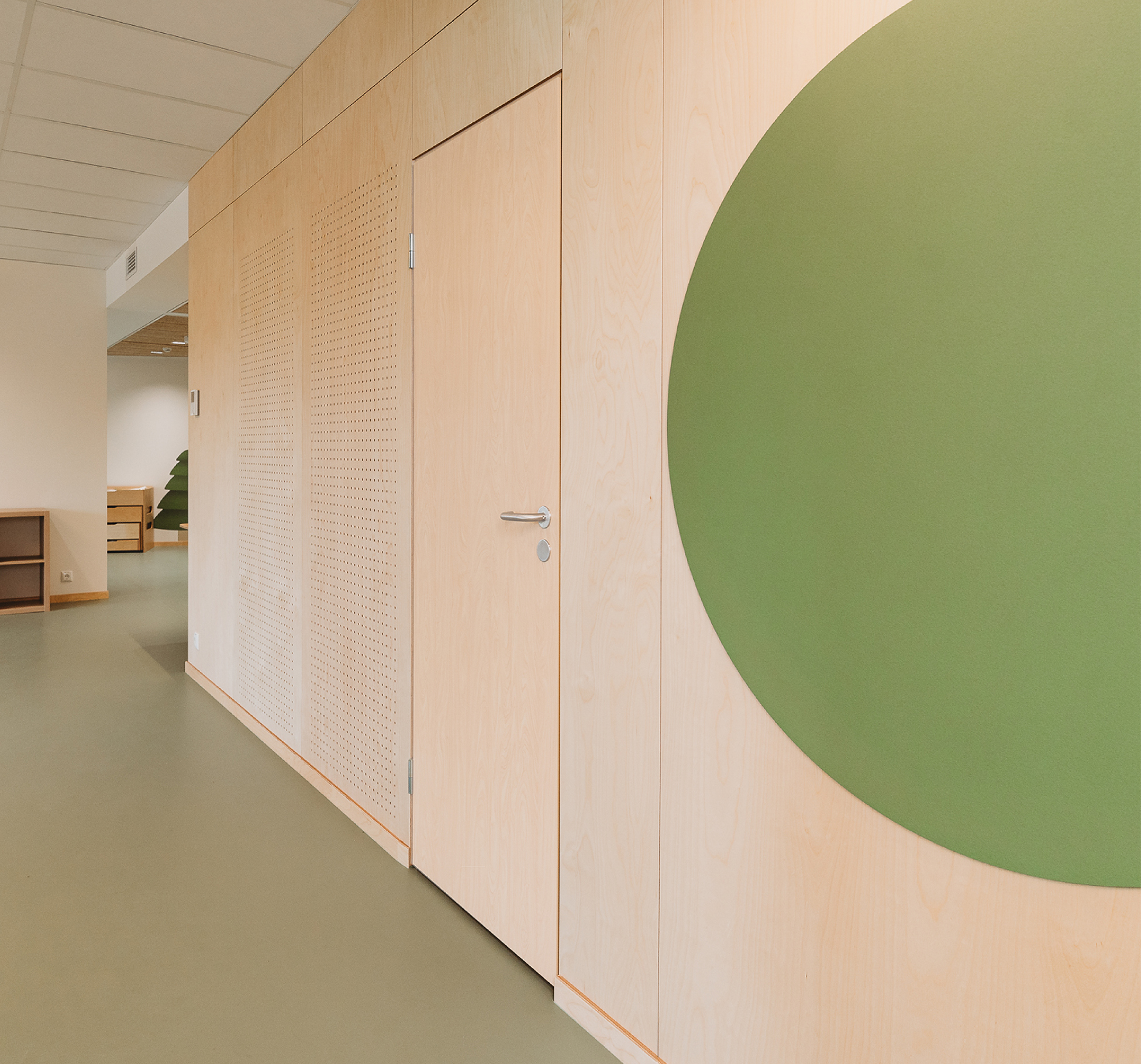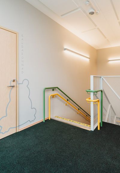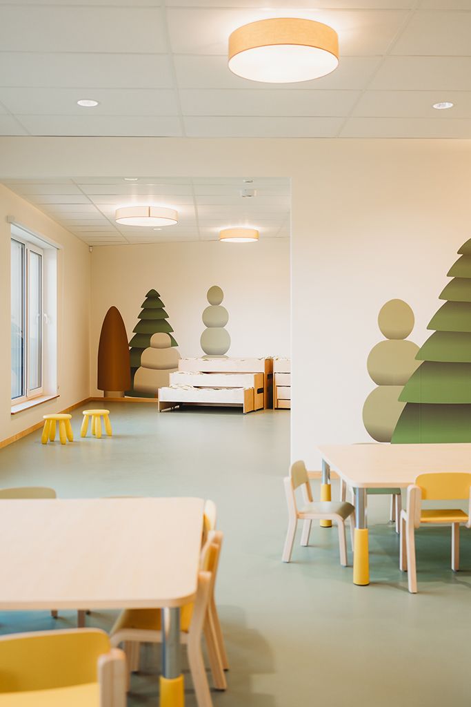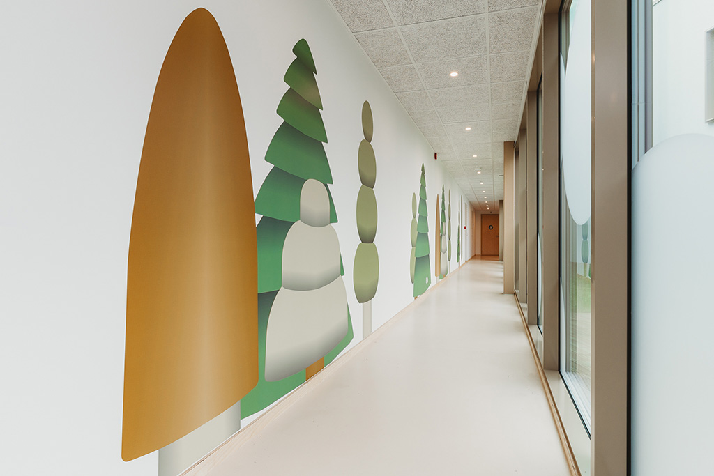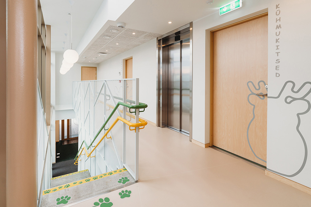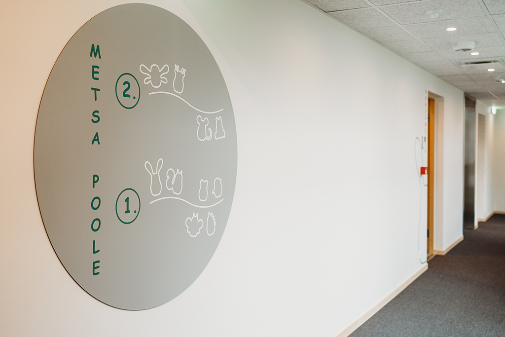 Mängulist metsas olemise tunnet loovad kõrged puude grupid, lapse kõrgused metsategelaste kujutised ja loomade jäljed. Metsategelastest rühmanimed on leitud lõbus-loovast sõnade mängust: Urujänesed, Künkakarud, Mättasiilid, Tõusukiilid, Voorehiired, Oruoravad, Ladvalinnud, Kühmukitsed, Lohuliblikad, Kaldakonnad. Ringi kujundit on kasutatud hoone sisemusse jääva klaasfassaadi markeerimiseks ja infotahvlite kujunduses.
