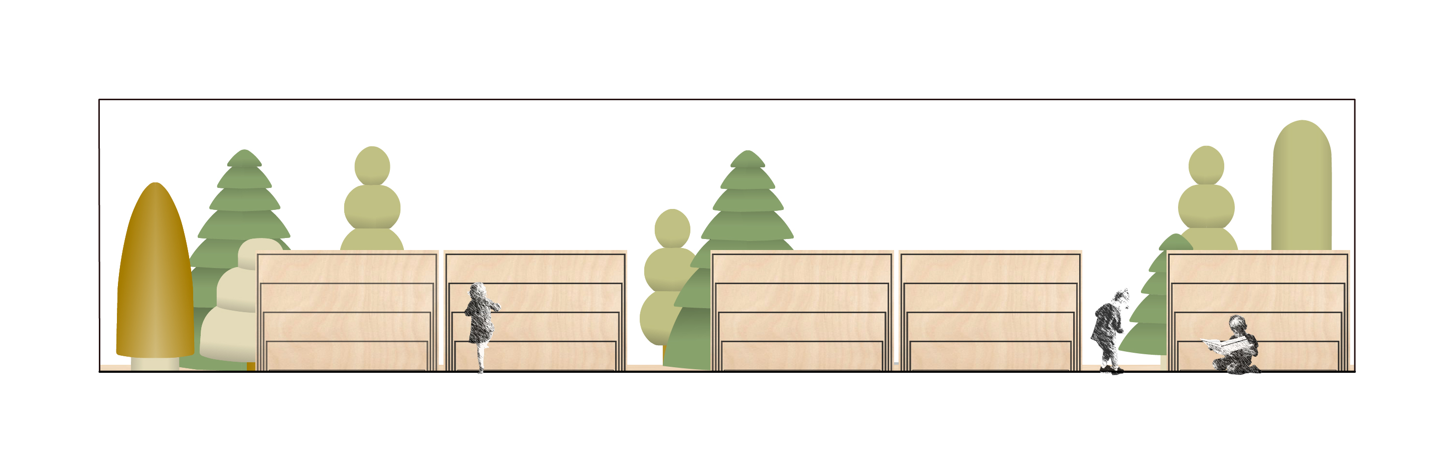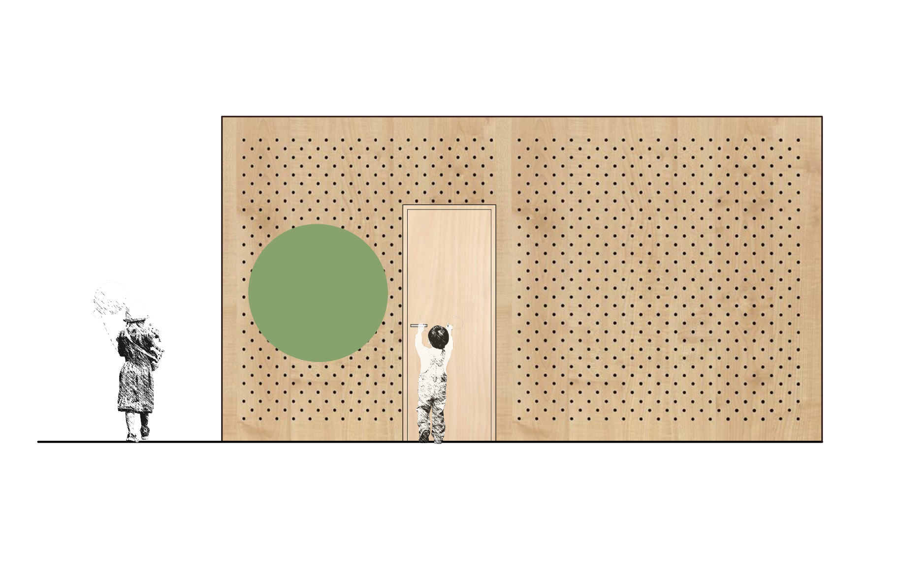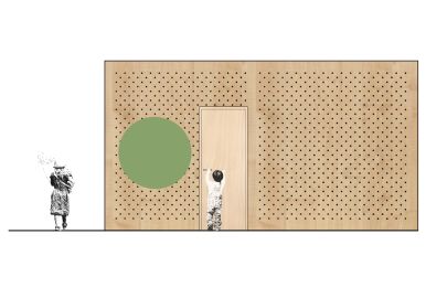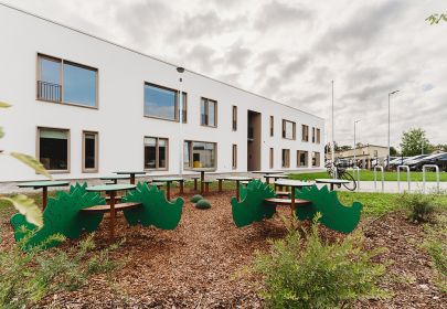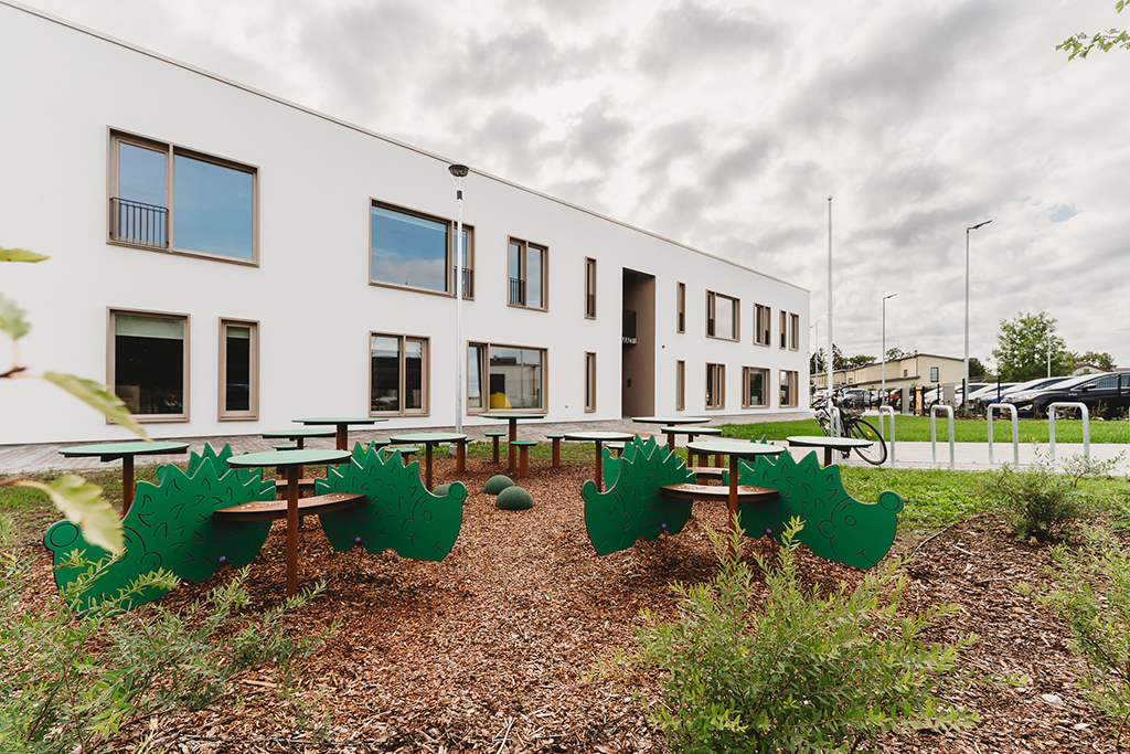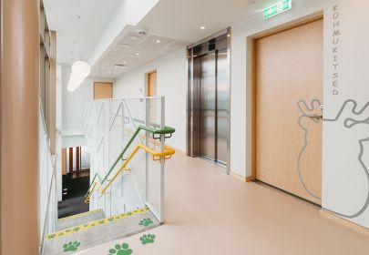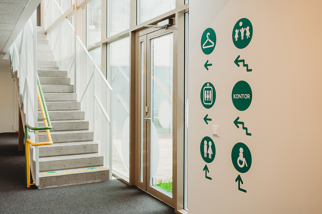Mängulist metsas olemise tunnet loovad kõrged puude grupid, lapse kõrgused metsategelaste kujutised ja loomade jäljed. Metsategelastest rühmanimed on leitud lõbus-loovast sõnade mängust: Urujänesed, Künkakarud, Mättasiilid, Tõusukiilid, Voorehiired, Oruoravad, Ladvalinnud, Kühmukitsed, Lohuliblikad, Kaldakonnad. Ringi kujundit on kasutatud hoone sisemusse jääva klaasfassaadi markeerimiseks ja infotahvlite kujunduses.