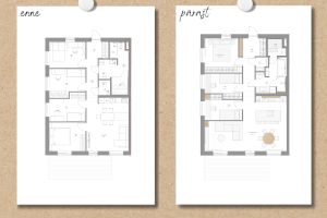 Siin näed kahte plaani – esialgset arendaja pakutud lahendust ning selle kõrvale meie loodud versiooni, mis sündis tihedas koostöös kliendiga ja nende eluviisist lähtudes. Oleme nihutanud seinu, muutnud ruumide funktsioone ning loonud paigutuse, kus iga ruum töötab tervikuna ja toetab igapäevast elu.